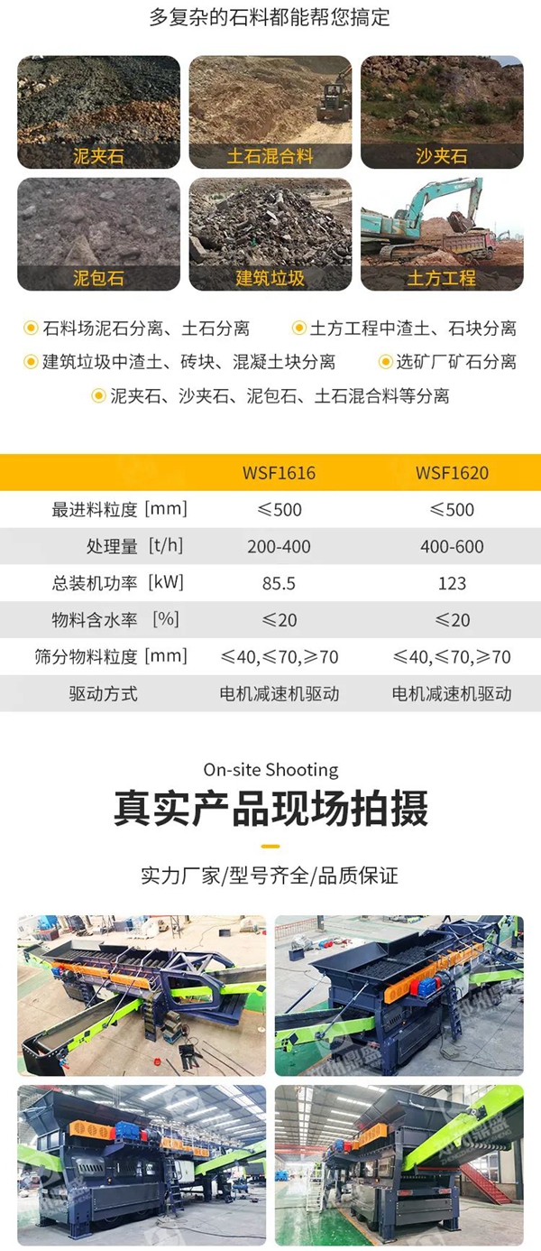 如果选用传统的振动筛和螺旋洗矿机作为泥石分离机可以吗?有些可以,有些根本无法做到。振动筛可以筛分粒度相差不大的泥土和碎石,对于大块石头和泥土分离难以做到,而且对于粘性高的泥土石头分离几乎不可能做到;螺旋洗矿机可以分离一定粘性的泥土和石头,但是需要大量的水,对于许多缺水的矿山来说,又是一个非常头疼的问题,甚至无水的时候,项目必须搁浅,无法开发。