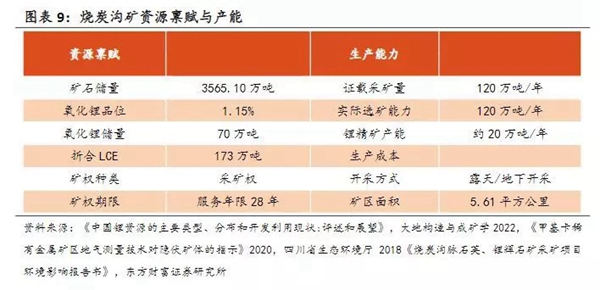 产能:烧炭沟矿区采用露天及地下两种开采方式,证载采矿量为120万吨每年,其中锂精矿产能约为20万吨每年。