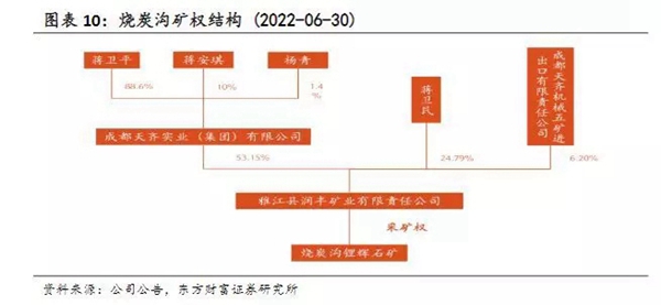 矿权归属:烧炭沟锂辉石矿的采矿权由天齐锂业子公司雅江润丰所有。该烧炭沟采矿权为雅江县润丰矿业所有,润丰矿业为天齐锂业控股子公司,天齐对其持股比例53.15%,蒋卫民持股24.79%,其他股东持股合计22.06%。