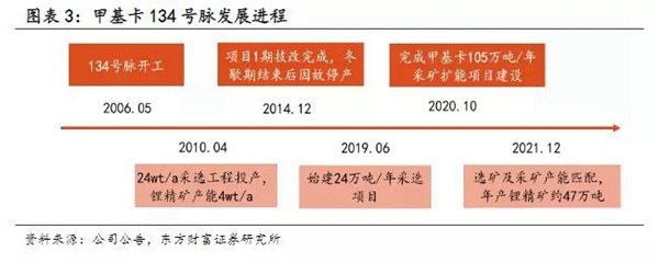 矿区情况:甲基卡锂辉石矿是国内为数不多的在产锂辉石矿,位于甘孜州康定、雅江、道孚三县交界处,是国内较大的固体锂辉石矿,矿区占地面积1.3平方公里,锂矿石储量近3000万吨,平均品位为1.42%,并且伴生有钽、铌、铍等稀有金属,资源禀赋优良,开采方式为露天开采。甲基卡134号脉开发始于2005 年,但由于征地、环保等不可抗力因素,2014 年起生产被迫中断,2019 年中旬重启复产至今,生产顺利。