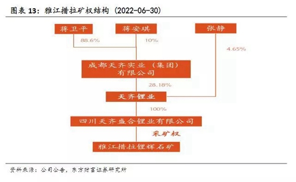 矿权归属:雅江措拉锂矿采矿权属于天齐锂业,实控人为蒋卫平。雅江措拉锂矿采矿权为天齐盛合(天齐锂业子公司)所有,实控人蒋卫平及其一致行动人通过天齐集团持有上市公司天齐锂业28.18%股权,另外蒋卫平之妻张静亦直接持有天齐锂业4.65%股权,两者持有权益合计约33%。
