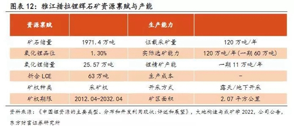 资源禀赋&产能:(1)禀赋。四川省雅江县措拉锂辉石矿区的矿石储量为1971.4万吨,Li2O储量25.57万吨(折合LCE63万吨),平均Li2O品位为1.30%,伴生铍、铌、钽。(2)产能。该矿区采用露天及地下两种开采方式,证载采矿量为120万吨每年,其中一期锂精矿产能为11万吨每年。是天齐锂业在国内布局的主要锂精矿,拟采用“浮选+磁选”采选工艺,目前为缓建状态。据天齐锂业22H1半年报,截至本期末,受多种因素影响,雅江县措拉锂辉石矿采选矿一期工程项目尚无重大进展,公司正在就该项目重启进行相应的可行性研究,计划在不久的将来尽快重启国内雅江措拉锂矿的开采和生产。