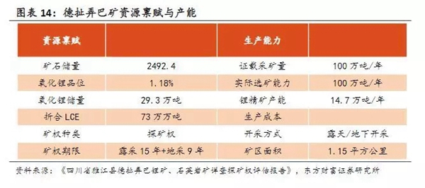 资源禀赋:根据云南陆缘衡矿业权评估有限公司出具的《四川省雅江县德扯弄巴锂矿、石英岩矿详查探矿权评估报告》,德扯弄巴锂矿的矿石资源储量2492.4万吨,氧化锂品位1.18%,折合Li2O资源储量约29.3万吨,折合碳酸锂当量72.4万吨,属于特大型锂矿。
