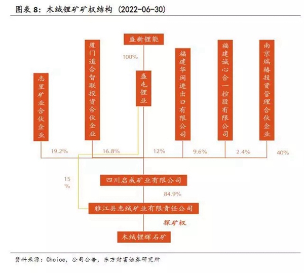 矿权归属:木绒锂矿探矿权归属于雅江惠绒,尚未开采投产。据盛新锂能21年报披露,木绒锂矿尚处于勘探阶段,并无采矿权,该矿山项目的储量报告正在编制中,后续惠绒矿业将适时推进探转采的相关工作。雅江惠绒为四川启成矿业有限公司的控股,启成矿业持股84.9%,而启成矿业股权由多方组成,较为分散。