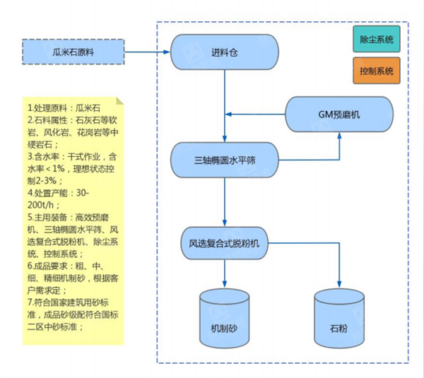 瓜米石俗称为石沫,颗粒大小与绿豆相似,是一种碎石料,又称为石粉、豆石,因品相与瓜子片相像,颗粒小而又常见于针片状存在,所以限制了其的使用领域,给骨料销售带来困难,时常于低价格或者废弃料处置。为帮助客户解决瓜米石使用面窄,处置价格低,销售困难的问题,鼎盛公司抓住客户困境重视客户体验,并根据瓜米石颗粒粒度小,再处置破碎困难,处置成本高,细筛分困难等的特性,且在干法作业与湿法作业的选择中,选择干法脱粉保证生产工况,通过一系列设备改良,工艺优化组合,推出瓜米石专用干法制砂系统,逐步解决上述问题,将低价格的废弃瓜米石,一举成功转化成高性价比的人工机制砂。