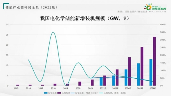 根据国家发展改革委、国家能源局发布的《关于加快推动新型储能发展的指导意见》规划,2025年我国将实现新型储能装机规模 30GW 以上,据 CNESA 保守估测,2026年我国新型储能装机累计规模将达到48.5GW,对应2022-2026CAGR为 53.5%。
