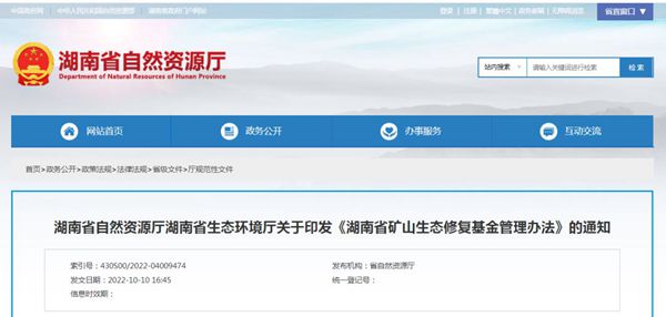 10月10日,湖南省自然资源厅、生态环境厅联合印发《湖南省矿山生态修复基金管理办法》(以下简称《办法》)。