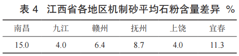 由图表 3 和 4 可以看出:江西省地区机制砂平均含粉量为 8.2%。其中九江、赣州、上饶地区机制砂石粉含量相对稳定,离散较小。南昌、抚州、宜春地区机制砂石粉含量相差较大,离散较大。从各个地区分析,南昌地区平均石粉含量为 15.0%,显著高于江西省地区石粉含量平均值,且所取的单个机制砂石粉含量均高于省内机制砂石粉含量平均值。九江地区石粉含量为 4.0%,显著低于省内机制砂石粉含量平均值,且石粉含量相对稳定。赣州地区石粉含量为 6.4%,低于省内机制砂石粉含量平均值,但其石粉含量普遍高于九江地区。抚州地区石粉含量为 8.7% 与省内机制砂石粉含量平均值相近,其机制砂石粉含量分布区间较广,高于或低于省内机制砂石粉含量平均值的石粉含量均存在。上饶地区石粉含量为 4.0%,显著低于省内机制砂石粉含量平均值,与九江地区石粉含量相当。宜春地区平均石粉含量为 11.3%,显著高于江西省地区石粉含量平均值,其机制砂石粉含量分布区间较广,高于或低于省内机制砂石粉含量平均值的石粉含量均存在,在所取机制砂 6 个区域中机制砂石粉含量离散最大。