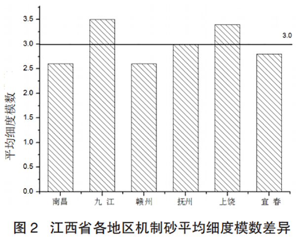由图表 1、2 可以得出:江西省机制砂细度模数均值为 3.0,即为中砂。南昌地区细度模数最小为 2.1,最大为 2.8,平均值为 2.6,离散较大,其普遍以中砂为主,低于江西省机制砂细度模数平均值。九江、赣州、抚州、上饶地区机制砂细度模数较为稳定,离散不大。九江和上饶地区机制砂平均细度模数分别为 3.5 和 3.4,达到粗砂标准,显著高于江西省机制砂细度模数平均值。抚州地区机制砂平均细度模数与江西省机制砂细度模数平均值相同。赣州地区机制砂平均细度模数为 2.6,低于江西省机制砂细度模数平均值,且与南昌地区相当。宜春地区细度模数最小为 2.1,最大为 3.2,平均值为 2.8,离散较大,且粗砂、中砂兼有,机制砂平均细度模数低于江西省机制砂细度模数平均值。从六个地区机制砂细度模数平均值可以看出,最小为 2.6,最大为 3.5,且省内平均细度模数为 3.0,省内机制砂分布离散较大。其中九江、上饶地区机制砂细度模数偏大,因其地域性原因(九江地区市场能够供应细度模数在 1.6 左右的细砂互掺使用,上饶地区同等强度等级混凝土配合比胶凝材料用量普遍高于其他地区),能够改善因机制砂偏粗造成混凝土和易性差。
