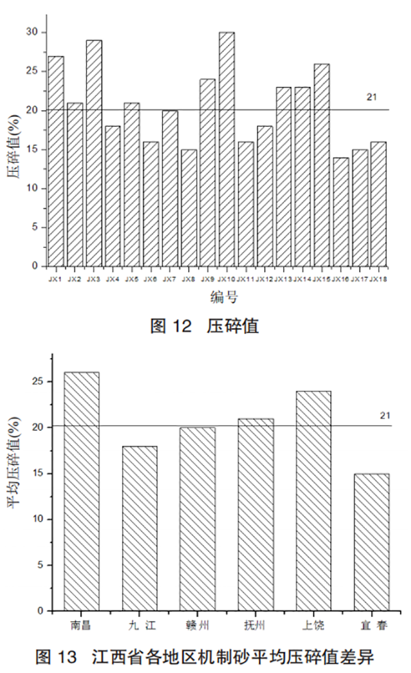 (5)江西省内机制砂平均压碎值为 21%,符合国家标准 GB/T 14684—2011《建设用砂》中砂的单级最大压碎值指标不得高于 30% 的要求。南昌地区机制砂单级最大压碎值指标平均值为 26%,为省内最高。宜春地区机制砂单级最大压碎值指标平均值为 15%,为省内最低。