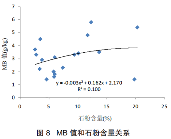1.6 机制砂 MB 值与石粉含量分析将全省机制砂石粉含量测试和 MB 值测试所得的数据进行作图分析,如图 8 所示。由图 8 可知,机制砂的石粉含量与石粉含量呈二次函数关系,随着石粉含量的增大机制砂的 MB 值呈递增趋势,二次函数的相关系数是 R2=0.100,表明两者具有一定关系。原因是亚甲蓝(Methylene Blue),又称亚甲基蓝,是一种吩噻嗪类染料芳香杂环化合物,其化学式为 C16H18N3ClS,常被用作化学指示剂。亚甲蓝溶液属于阳离子染料,溶液中含有大量 C16H18N3S+离子,极易吸附在带有相反电荷的黏土颗粒表面,因石粉含量越高,导致机制砂比表面积增大,亚甲蓝更为容易被吸附,因此 MB 值升高。但从图 8 多项式可以看出,石粉含量导致 MB 值升高影响相对较小。