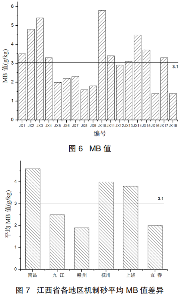 由表 5、表 6 和图 6、图 7 可以看出:江西省内机制砂 MB 值平均值为 3.1g/kg,已显著高于国家标准 GB/T 14684—2011《建设用砂》中砂的 MB 值不得大于 1.4g/kg 的指标。南昌地区平均 MB 值为 4.6g/kg,显著高于江西省内机制砂平均 MB 值,MB 值离散较大。九江地区平均 MB 值为 2.5g/kg,低于江西省内机制砂 MB 值平均值,但依然高于国家标准规定值,离散较小。赣州地区平均 MB 值为 1.9g/kg,显著低于江西省内机制砂 MB 值平均值,但依然高于国家标准规定值,离散较小,为所选地区中 MB 值平均值最低。抚州地区平均 MB 值为 4.0g/kg,显著高于江西省内机制砂 MB 值平均值,离散大。上饶地区平均 MB 值为 3.8g/kg,高于江西省内机制砂 MB 值平均值,且所有样品 MB 值均高于江西省内机制砂 MB 值平均值,离散较大。宜春地区平均 MB 值为 2.0g/kg,显著低于江西省内机制砂 MB 值平均值,但依然高于国家标准规定值。但宜春区域所选机制砂中,两个样品符合国家标准 GB/T 14684—2011《建设用砂》中砂的 MB 值不得大于 1.4g/kg 的指标,因其离散大,造成平均 MB 值偏高。