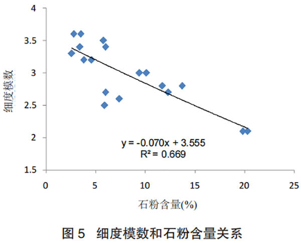 由图 5 可知,机制砂的石粉含量与细度模数呈线性关系,随着石粉含量的增大机制砂的细度模数呈递减趋势,相关系数是 R2=0.669,表明两者相关关系较大。原因为机制砂破碎过程中,各级配档位分布具有一定稳定性,因其石粉含量部分增加,其余级配筛余相对减少,细度模数相应有所增加。且石粉含量越高,说明机制砂粉磨更充分或原材料易于破碎,因此,机制砂细组分筛余相对偏高,也会导致细度模数降低。