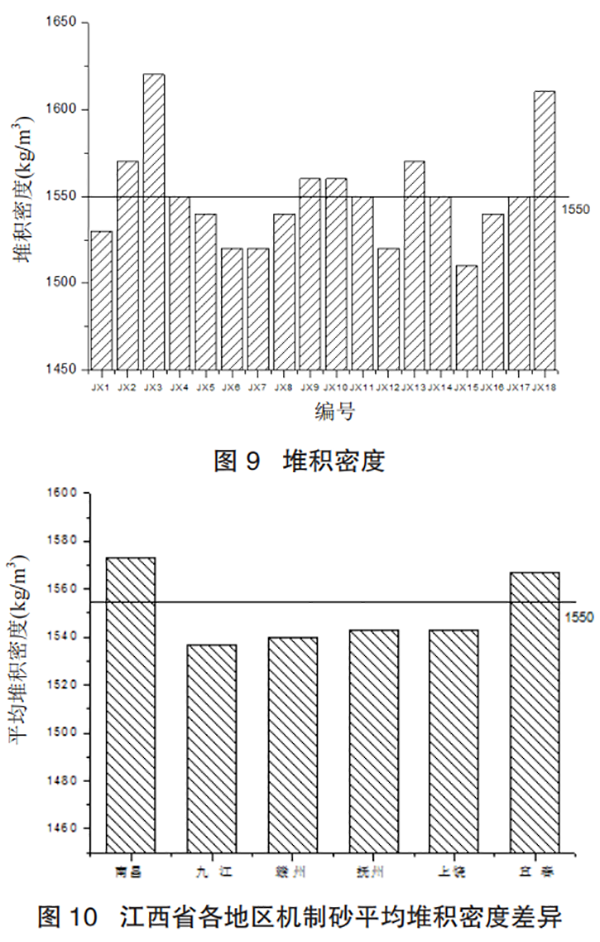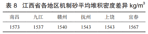 由图 9、图 10 可知,江西省内机制砂平均松散堆积密度为 1550kg/m3,符合国家标准 GB/T 14684—2011《建设用砂》中砂的松散堆积密度不小于 1400kg/m3。南昌地区的平均松散堆积密度显著高于江西省内机制砂松散堆积密度平均值,离散较大。九江地区和赣州地区的平均松散堆积密度略微低于江西省内机制砂松散堆积密度平均值,离散较小。抚州地区的平均松散堆积密度略微低于江西省内机制砂松散堆积密度平均值,离散大。上饶地区的平均松散堆积密度与抚州地区的平均松散堆积密度相同,离散小。宜春地区的平均松散堆积密度显著高于江西省内机制砂松散堆积密度平均值,其松散堆积密度普遍偏高,离散较大。