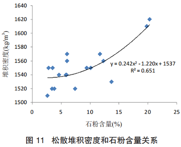 为了讨论机制砂的石粉含量和堆积密度之间的关系,将试验数据关系分析如图 11 所示,机制砂的石粉含量与堆积密度呈二次函数关系,随着石粉含量的增大机制砂的堆积呈二次函数,随着石粉含量增加逐步升高,二次函数的相关系数是 R2=0.651,表明两者相关关系较大。原因是当石粉含量提高,机制砂填充更为充分,因此松散堆积密度逐步增加。