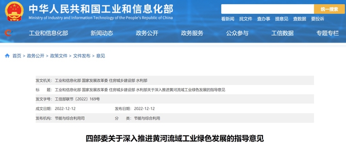 12月12日,工业和信息化部、国家发展改革委、住房城乡建设部、水利部四部门联合发布《关于深入推进黄河流域工业绿色发展的指导意见》,以下简称《意见》。